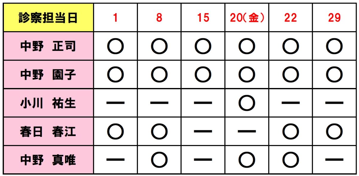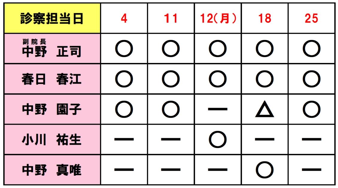 〇:終日勤務 △:午前診療 ー:お休み