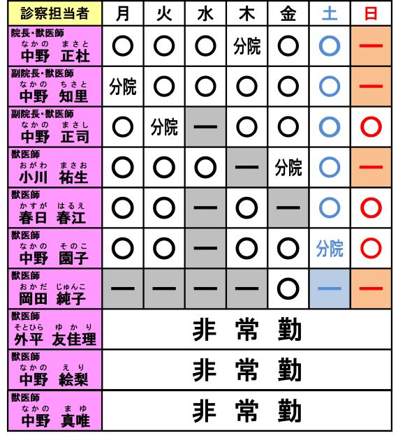 ・日曜・祝祭日の午後は、当番獣医師数名での診察になります。(下記別表をご覧ください)